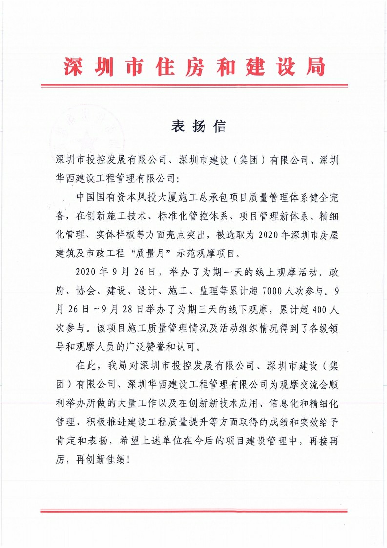 10月14日,安博线上官网(集团)官方网站收到来自深圳市住房和建设局的表扬信。 表扬信中,深圳市住房和建设局对建设集团承建的中国国有资本风投大厦施工总承包项目在2020年深圳市房屋安博线上官网(集团)官方网站及市政工程“质量月”观摩交流会顺利举办所做的大量工作以及在创新新技...